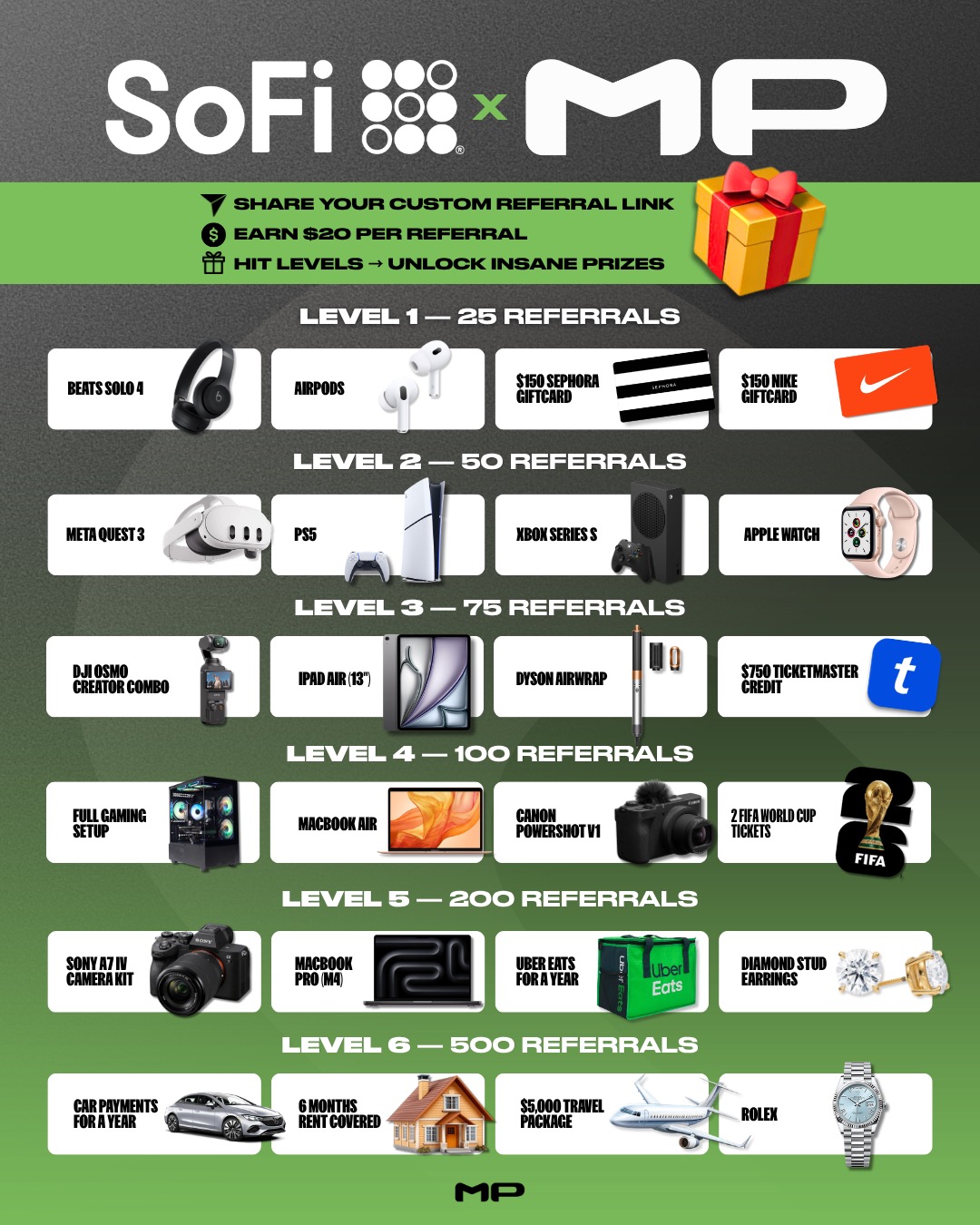 You’ll earn $20 for every successful referral. Then, on April 30th, we’ll look at your total number of successful referrals. Based on the level you reach, you can choose one of the four prizes shown, or a gift card to a brand of your choice of equal value.